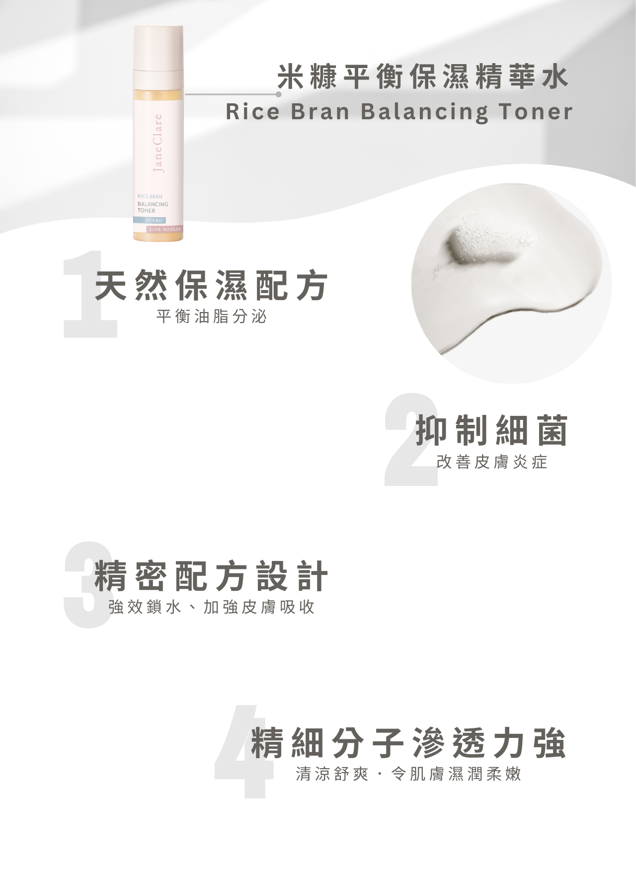 - 纳米化米糠深入肌肤底层,增强细胞锁水能力,修复受损的肌肤屏障。